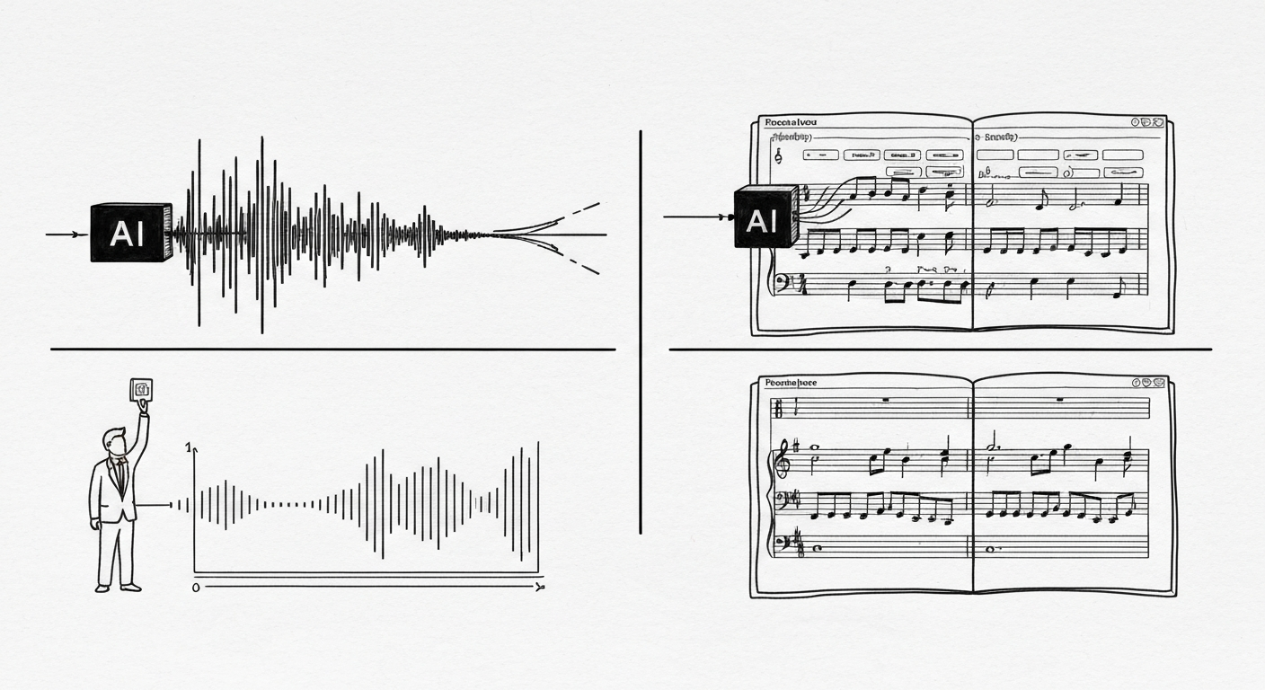 A useful analogy comes from AI music: some tools directly generate audio files, while some professional software uses AI to generate editable scores. After generation, users can still refine the result in a visual interface. In music, writing a score is called composition. This analogy is well suited to explain two AI paradigms in enterprise apps: one is biased toward “direct result generation,” and the other toward “editable structure generation.”
