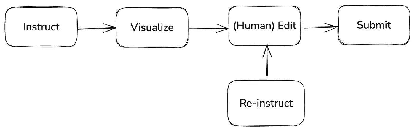 For serious business and professional applications, this is clearly insufficient. Especially for enterprise applications, users rely on them to complete very complex and critical tasks. All data or application fragments generated by generative AI must undergo user confirmation. This confirmation process must be properly presented through a GUI. This is why we need to incorporate a new paradigm into the fusion framework between AI and software products. I call this paradigm IVERS, which stands for Instruct, Visualize, Edit, Re-instruct, and Submit. The user gives instructions (which can also be triggered automatically); the software provides a visual rendering with operational handles; if the user is dissatisfied, they can issue new instructions or make manual edits; and finally, after confirmation, the process is submitted. Through this paradigm, we can connect the power of generative AI with the interaction tracks laid by existing software tools. This is like attaching a horse-drawn carriage axle to a mechanical power transmission device.