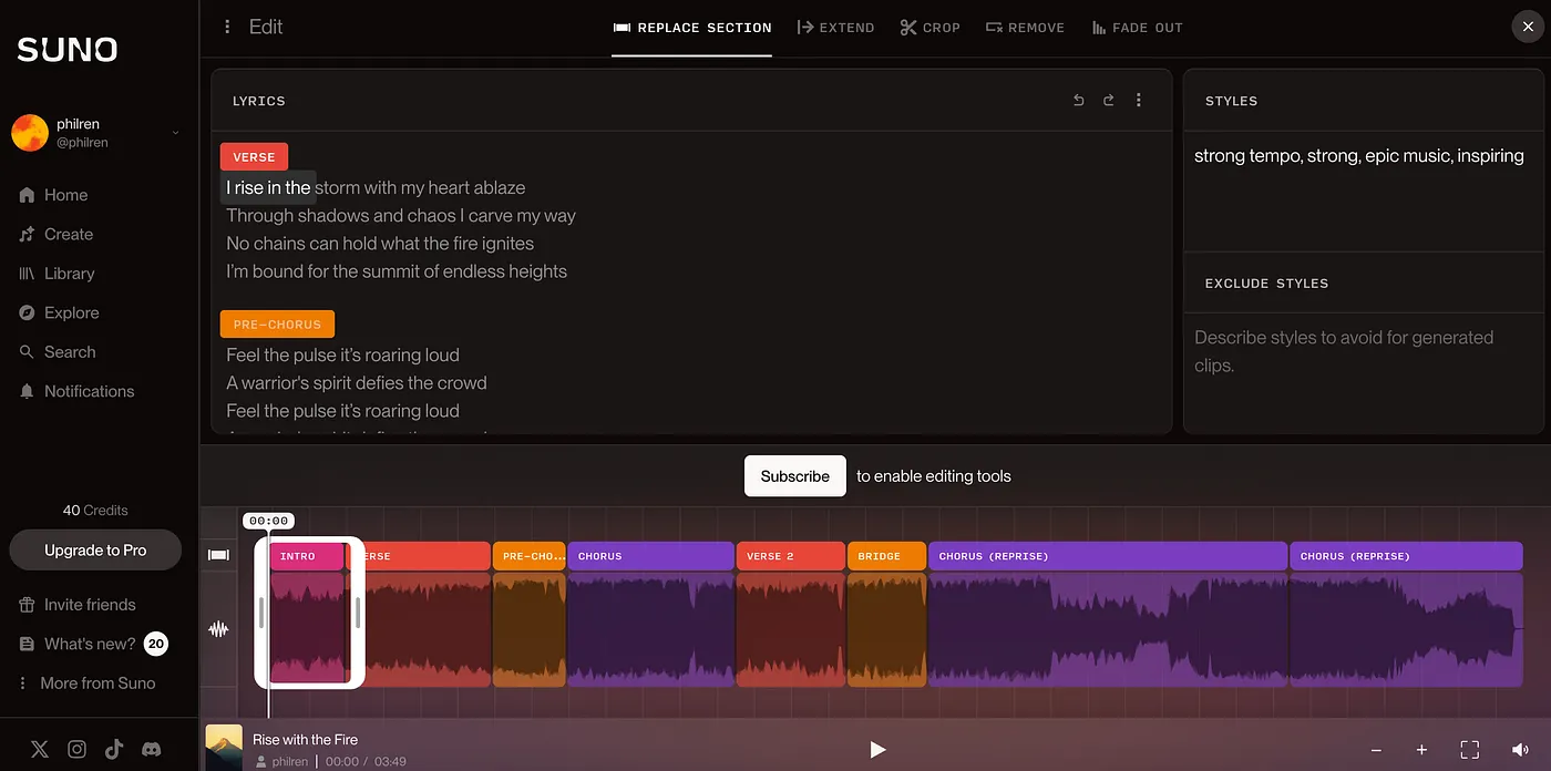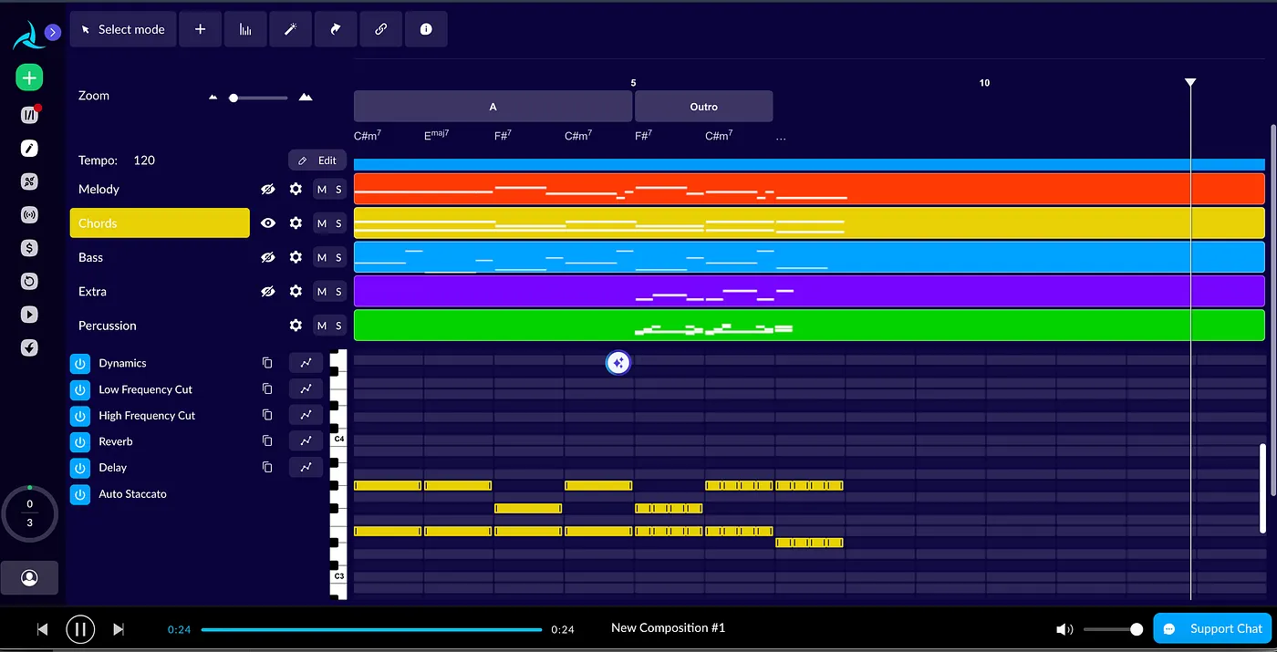 In contrast, newer native AI applications like SUNO generate music files based on prompts, but they only provide a Song Editor for users to modify segments of the song using new prompts. Ultimately, this approach generates music as it is, and users can’t have precise control over the results.
