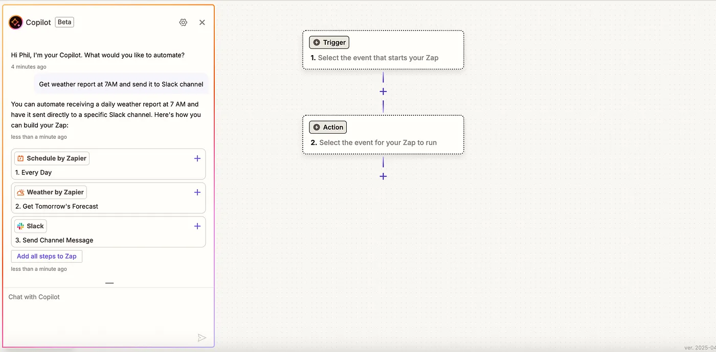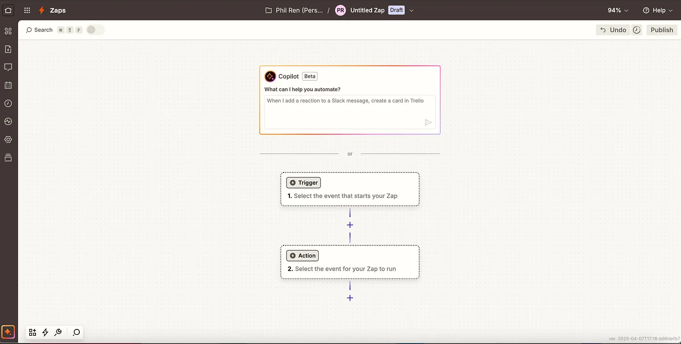 With these engineering efforts, Zapier was able to implement a viable workflow orchestration Copilot. This approach is far more reliable than a one-click generation of a workflow.